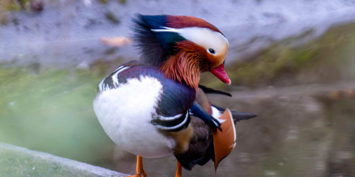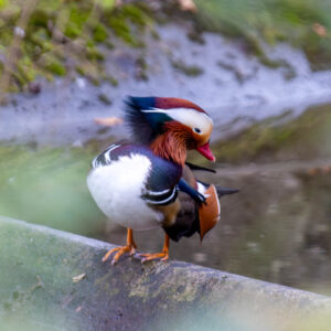 Die Mandarinente gehört zu den auffälligsten Enten überhaupt. Vor allem das Männchen hat ein besonders buntes und kunstvolles Gefieder.